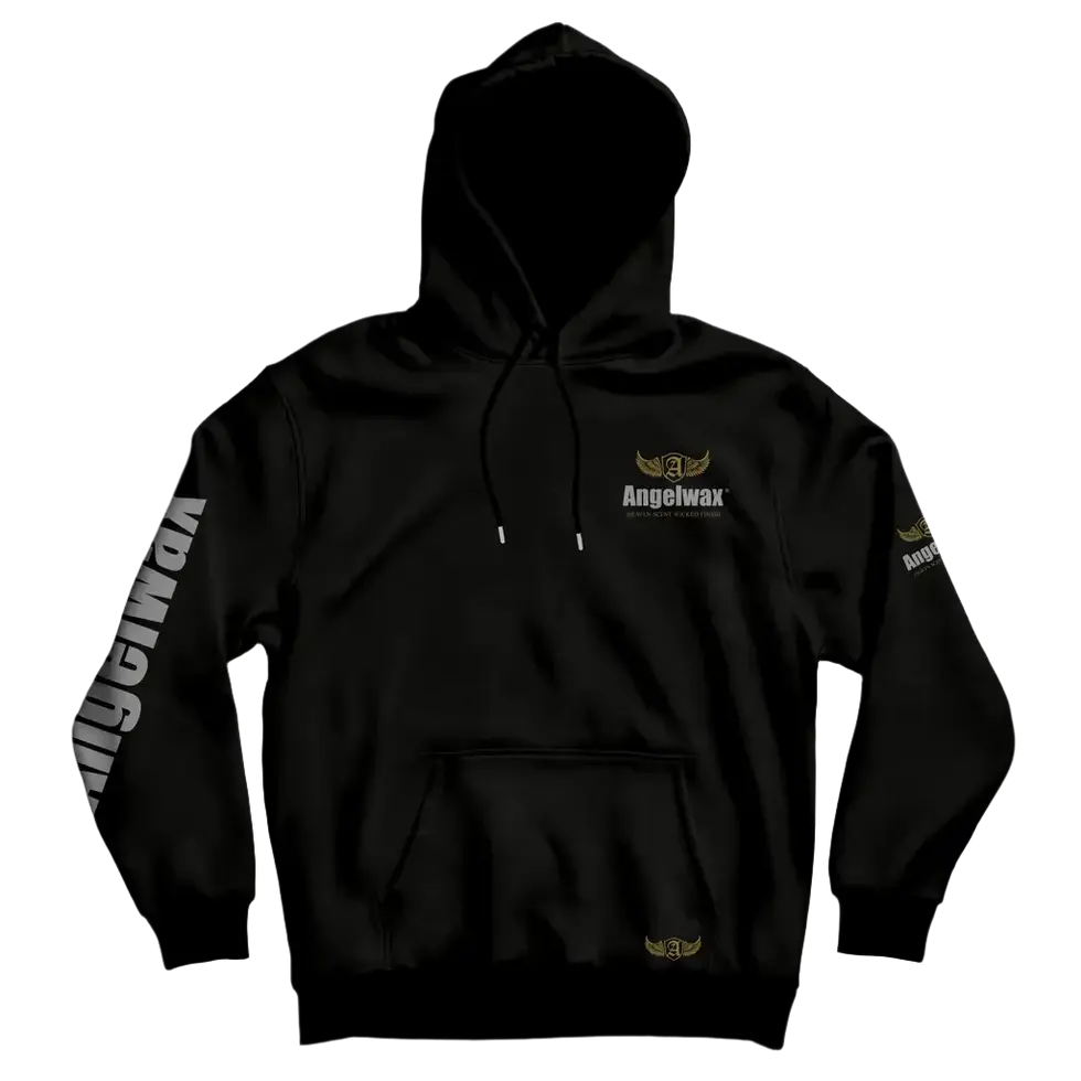 Chandail à capuchon de marque Angelwax, avec logos brodés à l’avant et sur la manche.
